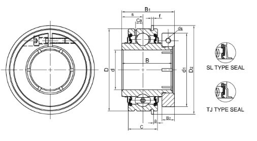 | d | D | B | C | S | B1 | B2 | a | f | D2 | d1 | ds | Ca | Cr | Cor | |||